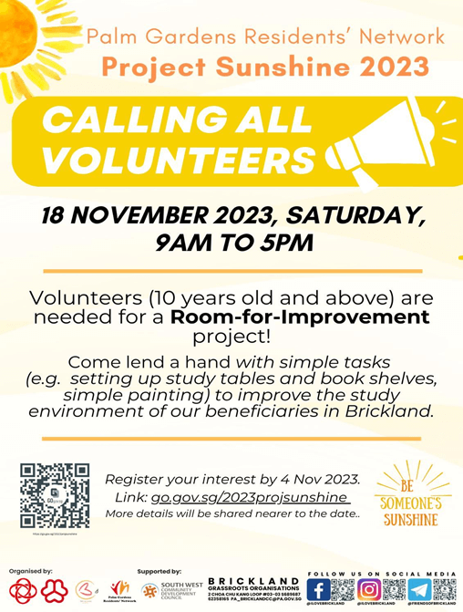 Palm Gardens RN – Project Sunshine 2023 (Brickland) – Sat 18 Nov 2023, 9am to 5pm Volunteers – Rajan Jain and his son Bhawana, Shruti and her son, Support 5 kids for study conditions – supported by The Sunshine Trust